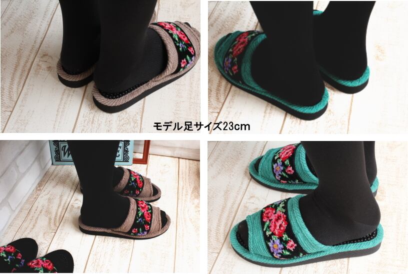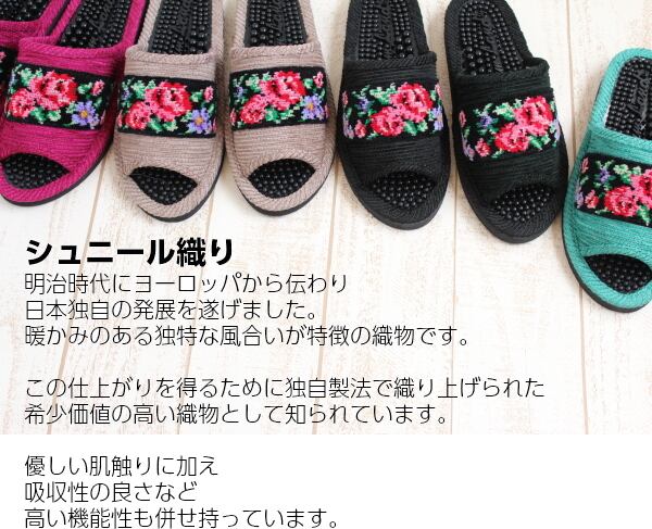 商品説明 シュニール織りの華やかなバラ柄のテープを乗せた健康スリッパです。20年前からデパートでもおなじみの商品。何年経っても飽きのこない定番品です
